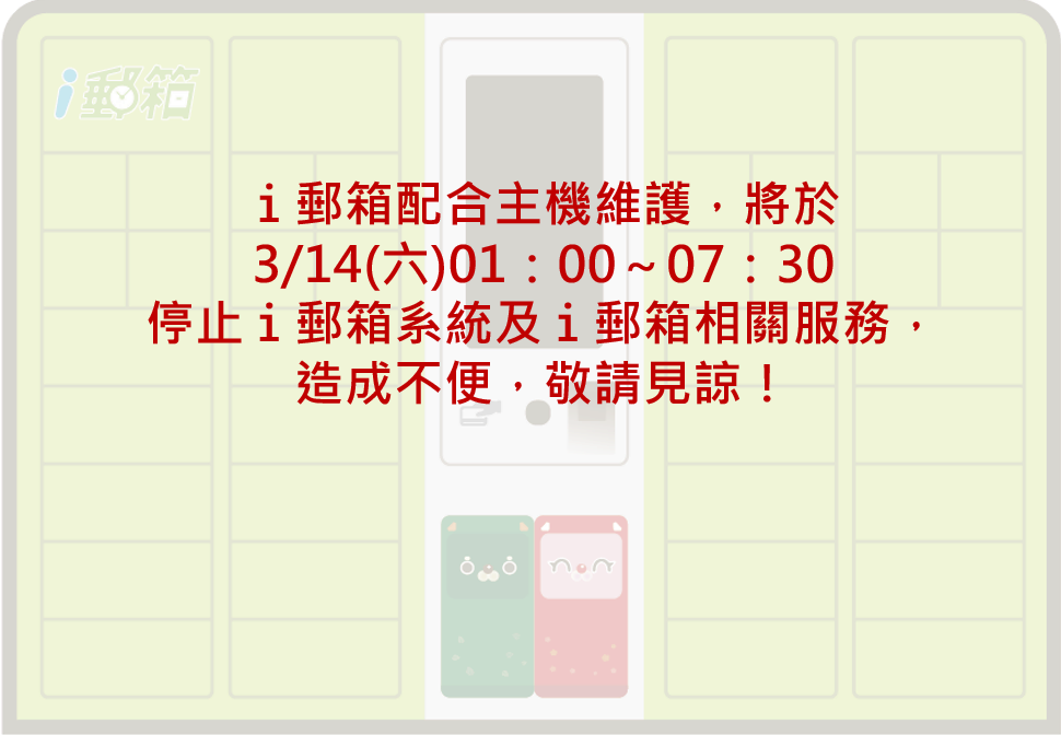 配合3/14(六) 01:00~07:30主機維護,i郵箱系統及i郵箱相關服務須於維護期間停止服務